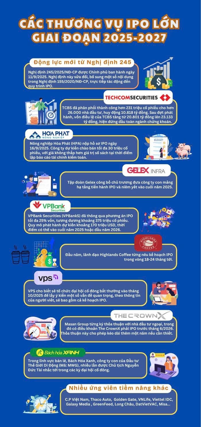 Danh sách “ứng viên” lần này thực sự đáng chú ý: từ Chứng khoán Techcombank (TCBS), Thaco Auto, Bách Hóa Xanh, Trung Nguyên Coffee, Nhà thuốc Long Châu cho tới VPS – những thương hiệu đã tạo dấu ấn mạnh mẽ trên thị trường. Theo Dragon Capital, trong 5 năm tới có thể xuất hiện tới 80 thương vụ IPO với tổng giá trị hơn 54 tỷ USD, một con số khổng lồ thể hiện sức hút ngày càng lớn của thị trường Việt Nam.