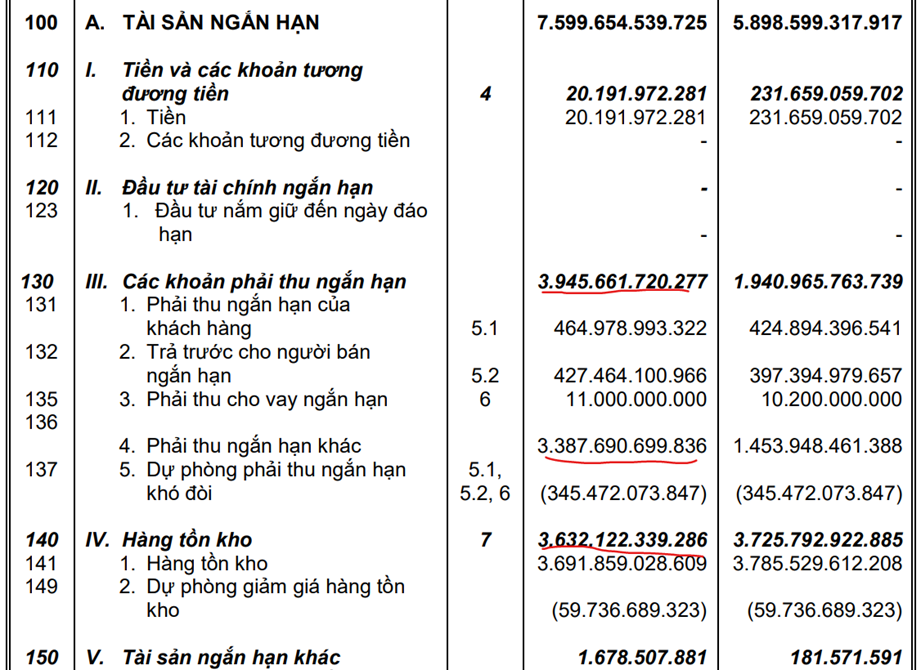 Nhìn vào bảng cân đối kế toán tài sản ngắn hạn tăng mạnh 1701 tỷ, từ 5.898 tỷ Q2 2021 lên 7.599 Q2 2022, nhưng tài sản lại tới tứ hàng tồn kho 3.632 tỷ và các khoản phải thu là 3.945 tỷ, trong 3.945 tỷ này thì có 3.387 tỷ không có thuyết minh >> không biết khoản phải thu này phải thu của ai, đây là số tiền không hề nhỏ cần phải chú ý. Tiền và các khoản tương đương tiền chỉ có 20 tỷ >> tiền không có trong công ty.