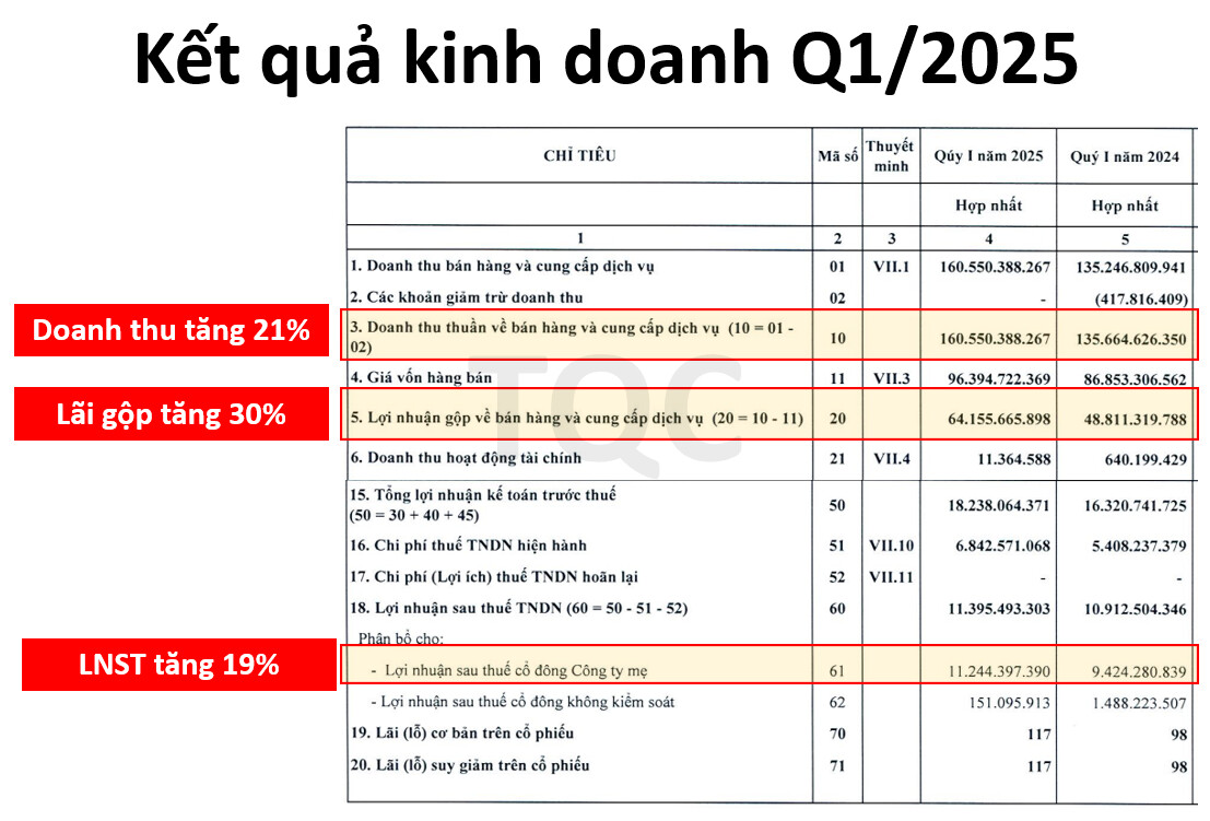 Trong Q1/2025, doanh thu của ITC đạt 160 tỷ và lợi nhuận gộp đạt 64 tỷ, lần lượt tăng 21% và 30% so với cùng kỳ. Sau khi trừ đi các khoản thu nhập và chi phí khác thì lợi nhuận sau thuế của ITC đạt 11 tỷ, tăng 19%.