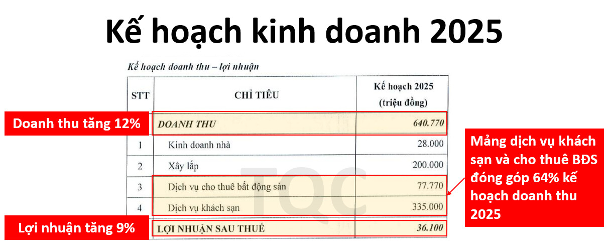 Trong 2025, ITC đặt mục tiêu doanh thu đạt 640 tỷ, tăng 12%, còn lợi nhuận sau thuế đạt 36 tỷ, tăng 9% so với cùng kỳ. Mảng dịch vụ khách sạn và cho thuê BĐS đóng góp 64% kế hoạch doanh thu 2025.