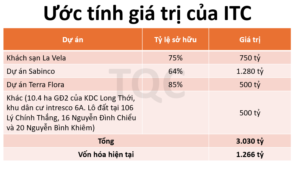 Tổng giá trị của các tài sản đang đem lại dòng tiền và các dự án đang thành hình trong tương lai của ITC khoảng 3.030 tỷ, nhưng vốn hóa hiện tại của doanh nghiệp mới chỉ là 1.266 tỷ. Vậy thì ITC đang được định giá tương đối hấp dẫn so với giá trị thực sự của doanh nghiệp.
