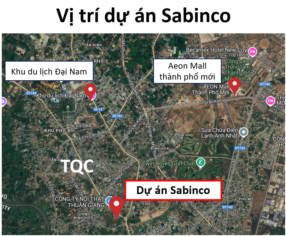 Dự án Sabinco nằm ngay mặt tiền đường Nguyễn Chí Thanh của TP.Thủ Dầu Một. Ngay cạnh dự án là khu du lịch Đại Nam (711 Ha) và Aeon Mal Thành Phố Mới (5.000 m2), điều này giúp đáp ứng đủ tiện ích cho cuộc sống của cư dân tại dự án trong tương lai. Ngoài ra, xung quanh dự án Sabinco cũng có nhiều khu công nghiệp.