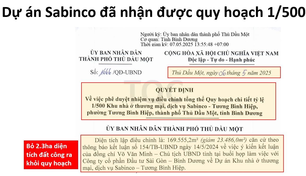 Đến ngày 06/05/2025, sau hơn 7 năm chờ đợi thì dự án Sabinco cũng đã nhận được quy hoạch chi tiết 1/500, và 2.3 ha diện tích đất công chưa thể xác định tiền sử dụng đất sẽ bị bỏ ra khỏi quy hoạch, do đó thì diện tích sau quy hoạch của dự án sẽ giảm từ 19.3 ha xuống chỉ còn 16.9 ha.