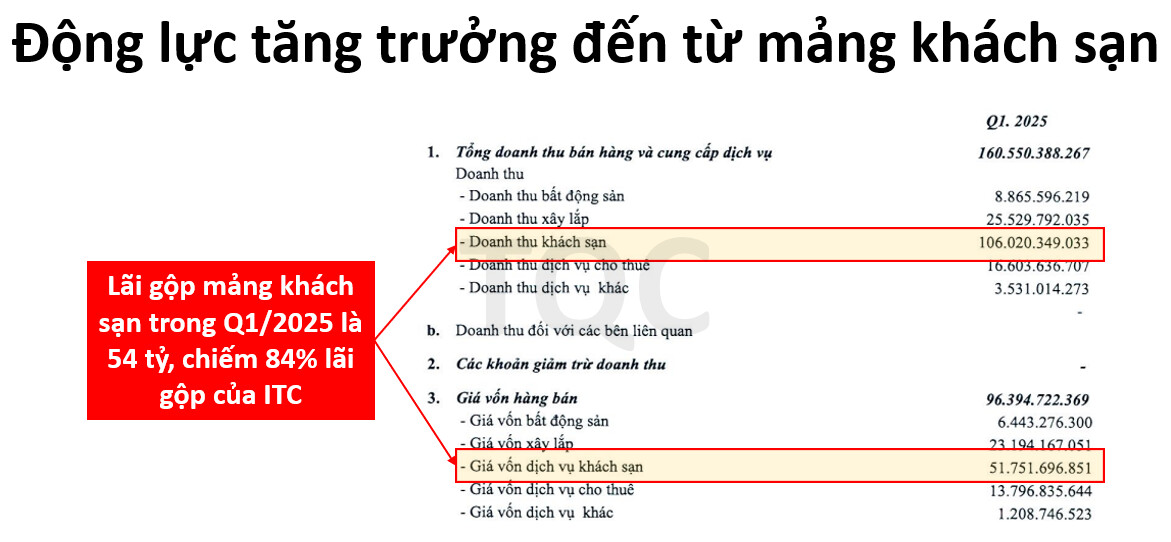 Mặc dù là doanh nghiệp BĐS, nhưng do các dự án có quy mô lớn vẫn chưa đủ điều kiện mở bán nên lợi nhuận hiện tại của ITC vẫn chủ yếu đến từ mảng khách sạn. Trong Q1/2025, lãi gộp của mảng khách sạn đã chiếm đến 84% tổng lãi gộp của ITC.