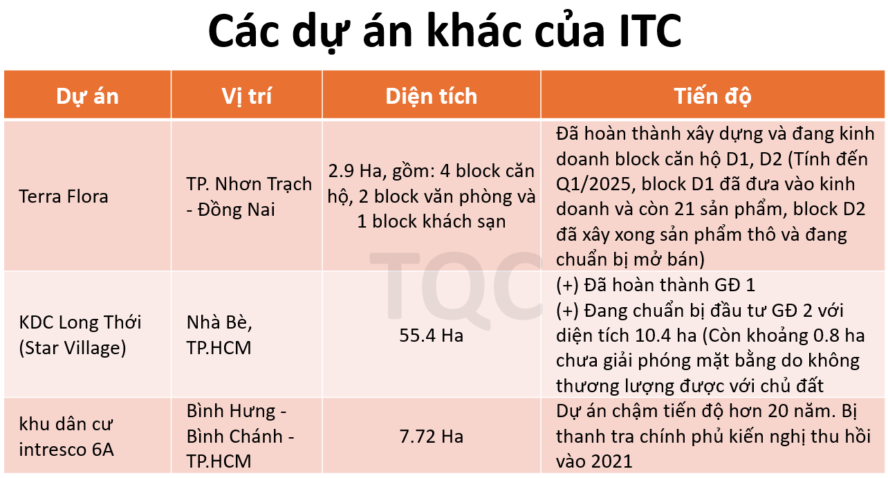 Ngoài dự án Sabinco và khách sạn La Vela thì ITC còn sở hữu thêm nhiều dự án khác nữa. Trong đó, dự án Terra Flora đang trong quá trình mở bán và đem lại dòng tiền cho ITC. Tính đến Q1/2025, block D1 của dự án Terra Flora đã đưa vào kinh doanh và còn 21 sản phẩm, block D2 đã xây xong sản phẩm thô và đang chuẩn bị mở bán.