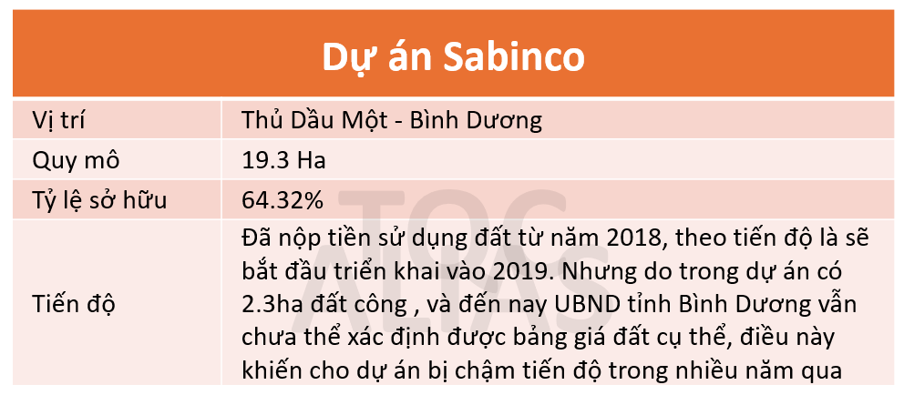 Sabinco là dự án có quy mô lớn nhất của ITC, tổng diện tích của dự án là 19.3 Ha. Doanh nghiệp đã nộp xong tiền sử dụng đất từ 2018, theo tiến độ là sẽ bắt đầu triển khai vào 2019. Nhưng do trong dự án có 2.3 ha là đất công, và đến nay UBND tỉnh Bình Dương vẫn chưa thể xác định được bảng giá đất cụ thể, điều này khiến cho dự án bị chậm tiến độ trong nhiều năm qua.
