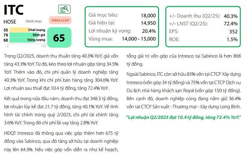 ITC đang ở vùng định giá hấp dẫn so với mặt bằng ngành. Với loạt dự án Sabinco, Star Village và Terra Flora, cùng sự đóng góp ổn định từ khách sạn La Vela, công ty có tiềm năng bước vào giai đoạn tăng trưởng lợi nhuận mạnh mẽ từ 2026 trở đi.