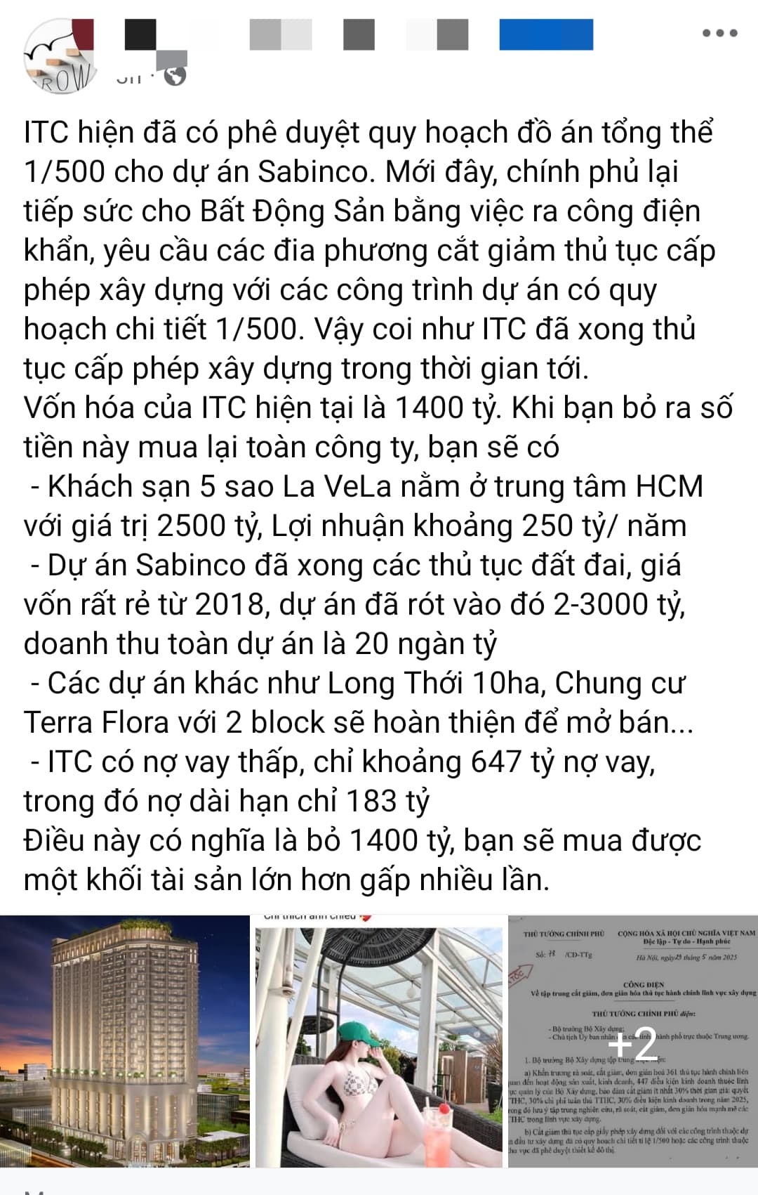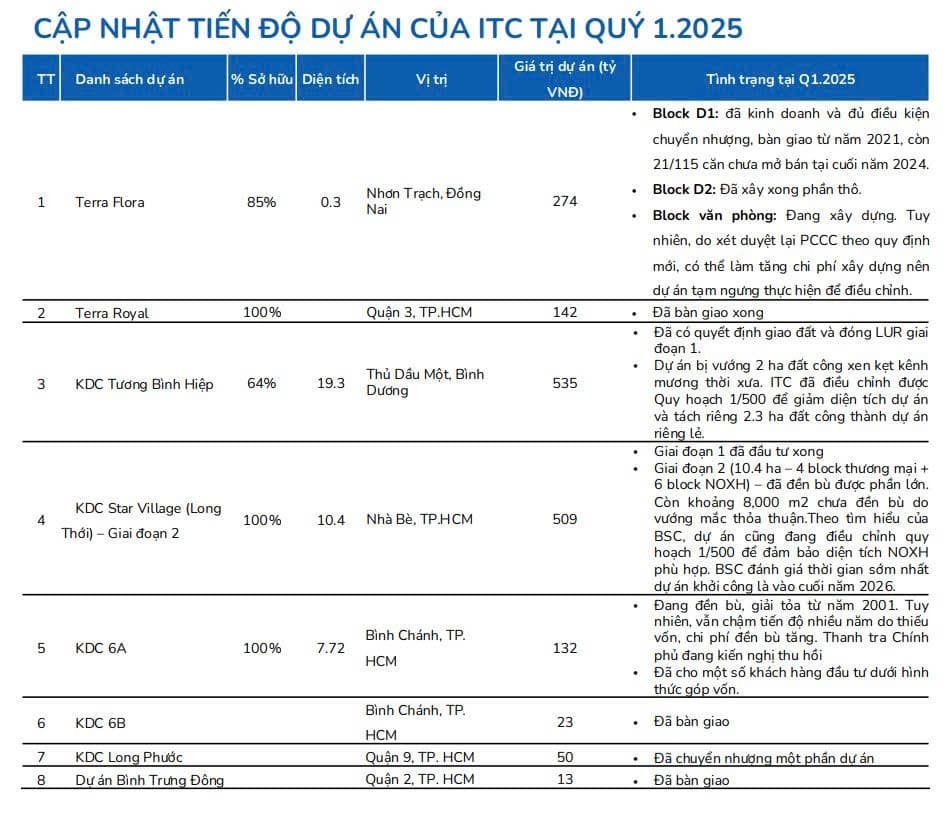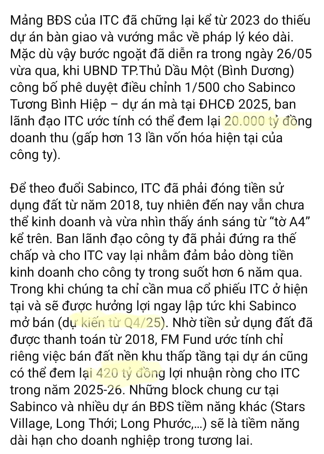 ITC là một công ty nhỏ, nhưng sở hữu quỹ đất có vị trí đắc địa tại TP.HCM, Bình Dương và Đồng Nai. Khi pháp lý được tháo gỡ, tiềm năng định giá lại sẽ rất lớn.