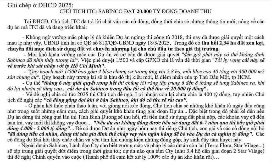 ITC độ lớn về quy mô dự án lên hơn 20 Ha và doanh thu cũng cao gấp 15 lần vốn hóa dự kiến