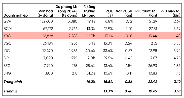 - KBC hiện đang giao dịch với P/E trượt 12T là 13.4x và P/B hiện tại là 1.48x, thấp hơn đáng kể so với P/E và P/B trung bình cũng như trung vị ngành BĐS KCN.