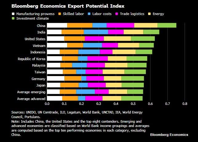 Bloomberg Economics vừa có một nghiên cứu về việc nước nào sẽ trở thành công xưởng của thế giới sau trật tự thuế quan mới, dựa trên chỉ số tiềm năng xuất khẩu. Việt nam đứng thứ 4.