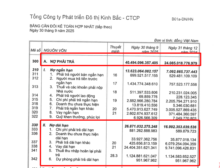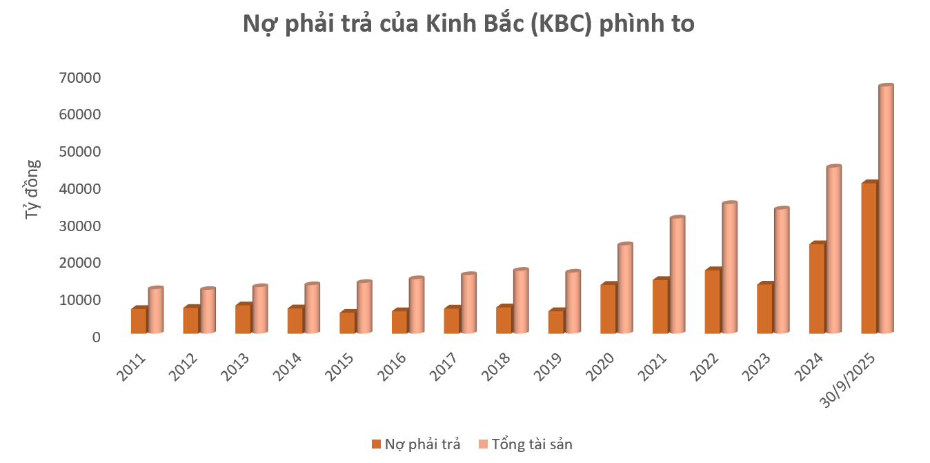 Chỉ trong gần 5 năm, tổng nợ phải trả đã tăng gấp ba, từ hơn 13.000 tỷ đồng đầu năm 2021 lên gần 40.500 tỷ đồng vào cuối quý III/2025, tương đương 61% tổng nguồn vốn.