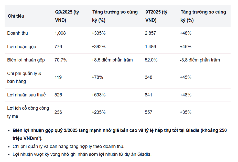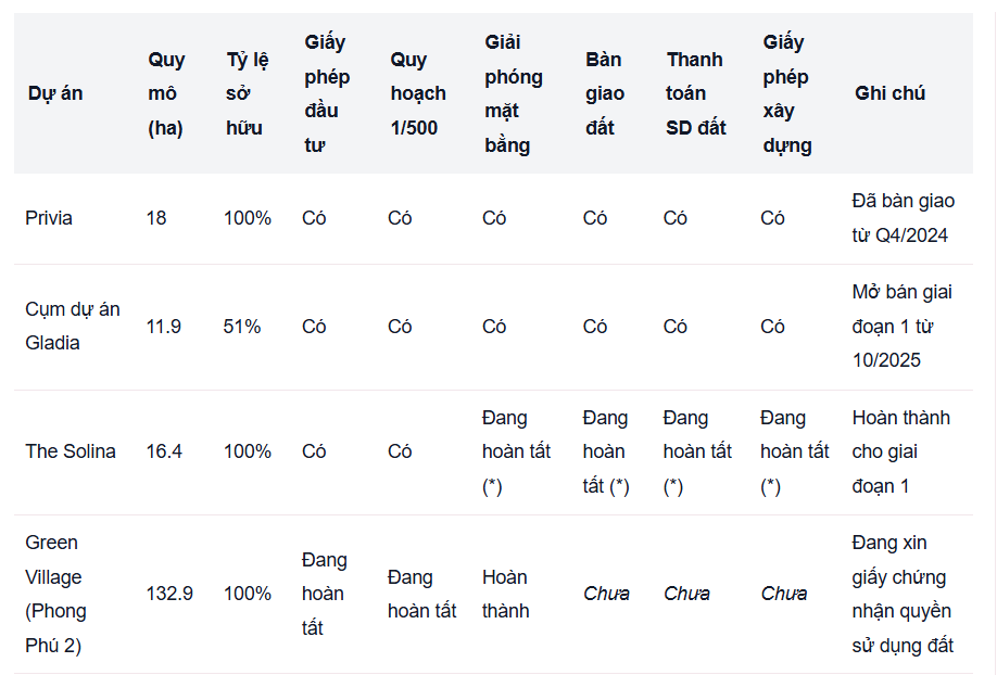- Cụm dự án Gladia: 51% sở hữu, đã mở bán và bàn giao giai đoạn 1, tiếp tục mở bán giai đoạn 2 trong Quý 4/2025.