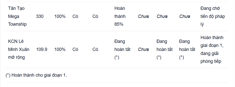 KCN Lê Minh Xuân: Giai đoạn 1 đã hoàn thành giải phóng mặt bằng và nhận giấy phép xây dựng, các giai đoạn tiếp theo đang giải phóng mặt bằng.