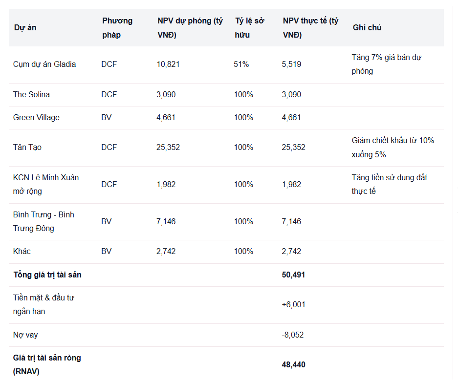 - Tân Tạo (100% sở hữu): 25.352 tỷ đồng, giảm chiết khấu từ 10% xuống 5% nhờ kỳ vọng pháp lý tích cực.