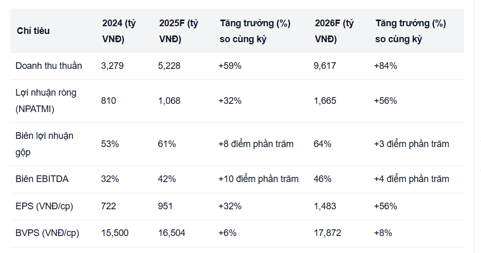 - Dự phóng doanh thu: 5.228 tỷ đồng năm 2025 (tăng 59% svck) và 9.617 tỷ đồng năm 2026 (tăng 84% svck).