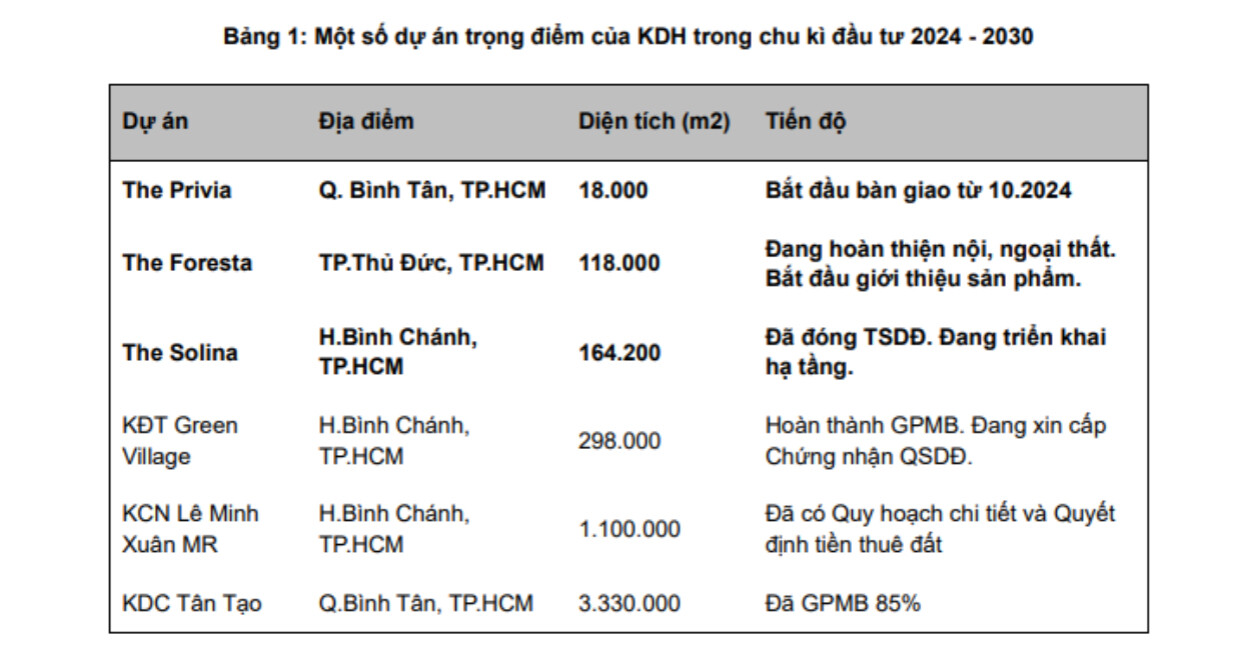 Dự án The Foresta, tọa lạc tại TP. Thủ Đức, TP. HCM, hiện đã hoàn thành thi công hạ tầng, xây thô và đang trong quá trình hoàn thiện nội – ngoại thất. Dự án này, được triển khai theo mô hình liên doanh cùng Keppel Land trên diện tích 11,8 ha với khoảng 200 căn liền kề – biệt thự, dự kiến sẽ bắt đầu đưa vào kinh doanh và bàn giao từ đầu năm 2025. Với mức giá bán dự kiến ở khoảng 200 – 250 triệu đồng/m², The Foresta được kỳ vọng sẽ đóng góp hơn 9.000 tỷ đồng doanh thu cho KDH trong giai đoạn 2025 – 2026, tận dụng xu hướng tăng giá và sự phục hồi tích cực của thị trường bất động sản khu Đông TP. HCM.