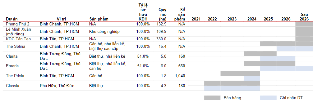 Ngoài Dự án The Privia, Khang Điền cũng sẵn sàng mở bán 3 dự án thấp tầng cao cấp trong giai đoạn 2024-2026, bao gồm Solina, Emeria và Clarita. Đây là những dự án có quy mô lớn và được đầu tư mạnh mẽ, đặc biệt tập trung vào phân khúc cao cấp. Dự án Solina đã hoàn thành giai đoạn giải phóng mặt bằng và dự kiến sẽ mở bán trong năm 2025. Trong khi đó, dự án Emeria và Clarita là hai phần của cụm dự án Foresta, tập trung vào phân khúc cao cấp tại khu vực Bình Trưng Đông của Thành phố Thủ Đức. Cả ba dự án này đều được kỳ vọng sẽ mang lại lợi nhuận lớn và đóng góp tích cực vào doanh thu của Khang Điền trong các năm tiếp theo.