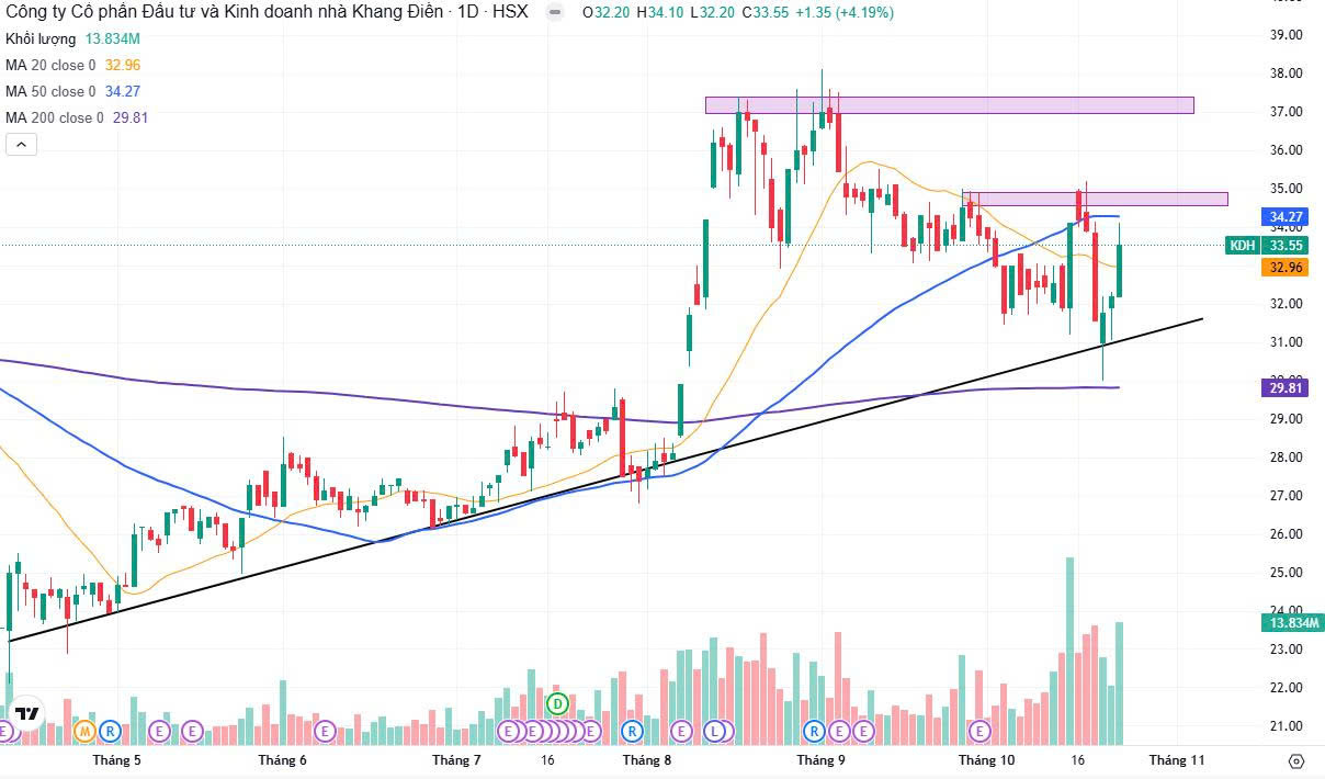 - Hiện tại KDH đang hồi phục và giữ được vùng hỗ trợ quanh khoảng 32.8-33.0, khối lượng giao dịch vượt mức trung bình nên đà tăng có khả năng tiếp diễn.