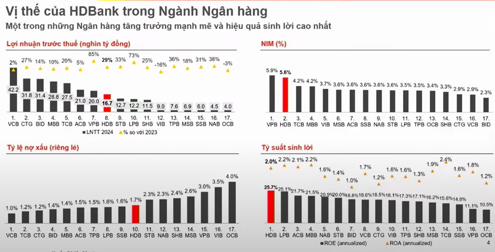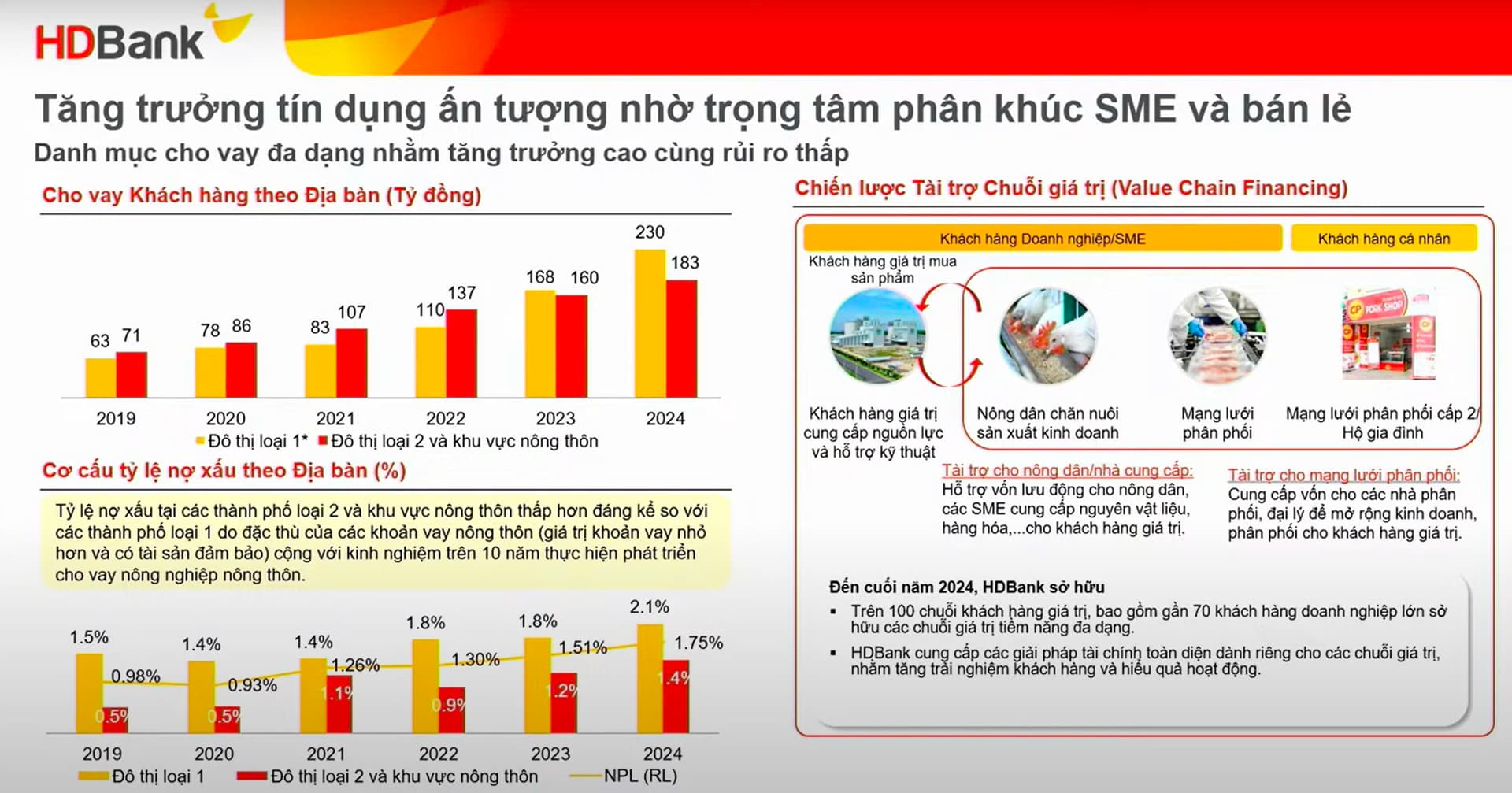 Tăng trưởng tín dụng năm 2025 của HDBank dự kiến tương đương hoặc vượt năm 2024 dựa trên chiến lược tập trung vào doanh nghiệp vừa và nhỏ, tài trợ chuỗi giá trị lớn, đặc biệt tại các khu vực đô thị loại 2 và nông thôn, đảm bảo kiểm soát tốt chất lượng tài sản.