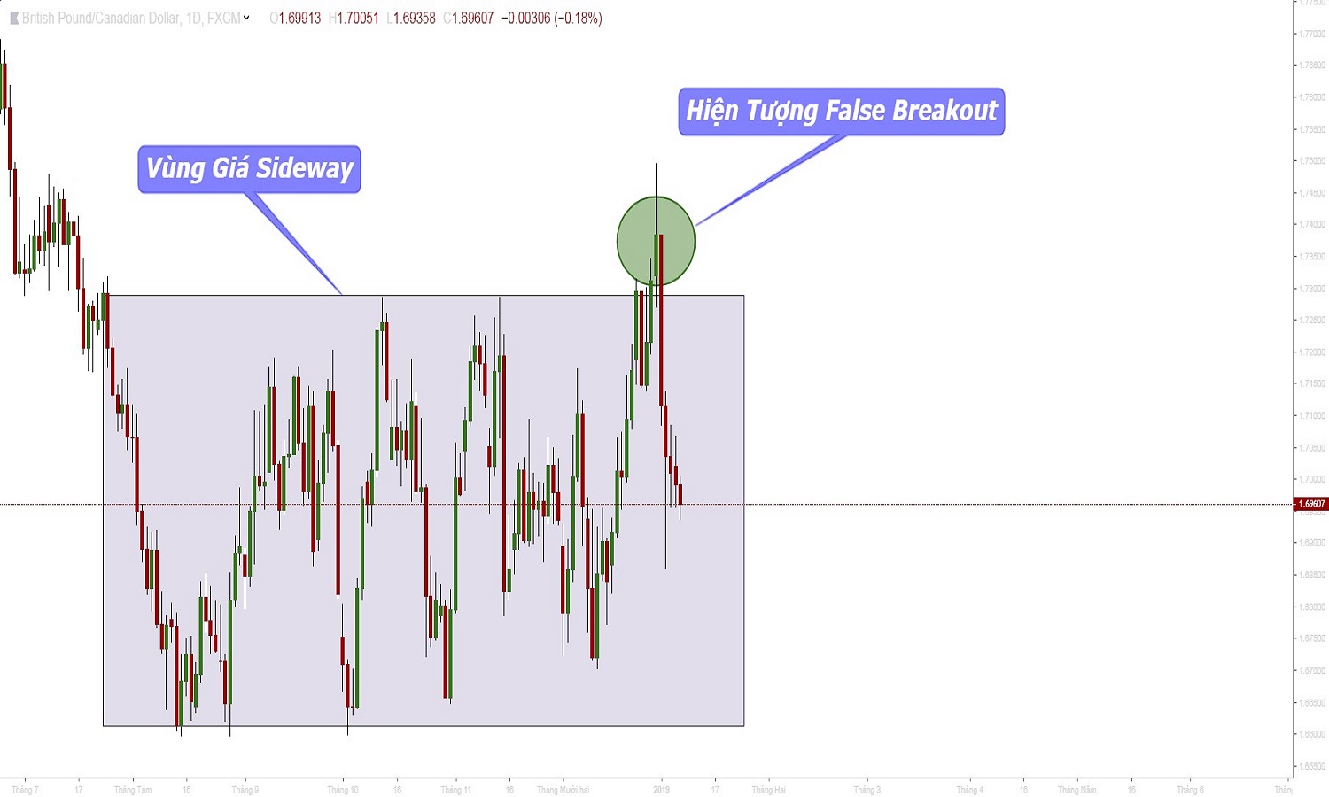 Hãy tưởng tượng bạn theo dõi một cặp tiền tệ và thấy giá vượt qua mức kháng cự quan trọng sau một chu kỳ tích lũy. Bạn quyết định mua tài sản sau khi cây nến xanh xuất hiện và vượt qua kháng cự. Tuy nhiên, sau đó, giá quay trở lại và tiếp tục theo xu hướng giảm, khiến bạn thua lỗ.
