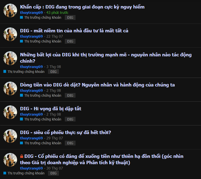 Những phiên gần đây là những phiên rất lình xình của DIG - kéo lên rồi lại đạp rồi lại kéo ATC rồi lại đạp… Nếu thằng nào bảo đây là hành động đè giá gom thì đúng là mấy con ếch ko biết nhìn vol và khối lượng trung bình.