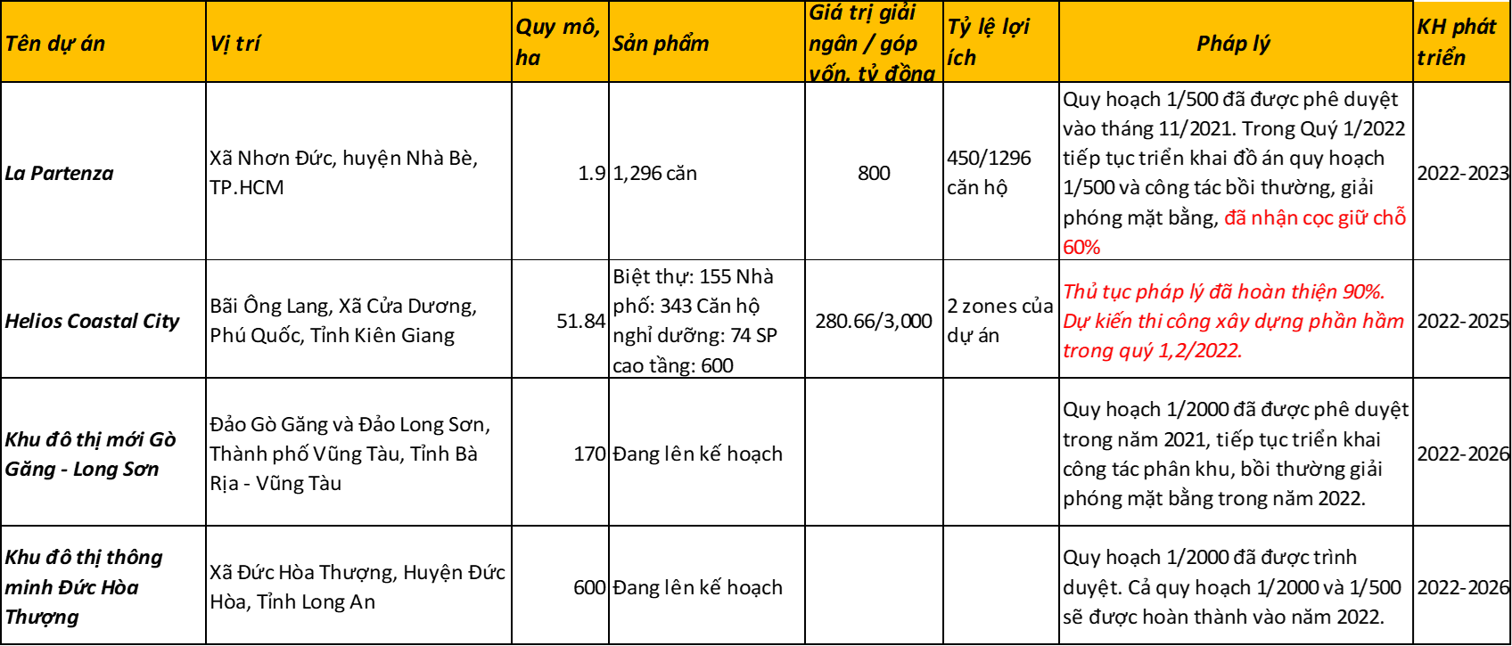 -Phát triển các dự án BDS sơ cấp do KHG làm chủ đầu tư thay vì phân phối tại các vị trí đắc địa như PhúQuốc, Vũng Tàu, Sài Gòn và bắt đầu mang lại dòng tiền từ 2022-2026, đặc biệt là dự án Helios Coastal City 52 Ha Phú Quốc thi công hầm Q2/2022, 450 căn tại dự án La Partenza Lê Văn Lương đã nhận cọc 60%, bàn giao 2023, ngoài ra còn 170ha tại Vũng tàu và 600ha tại Long An đã được duyệt quy hoạch 1/2000