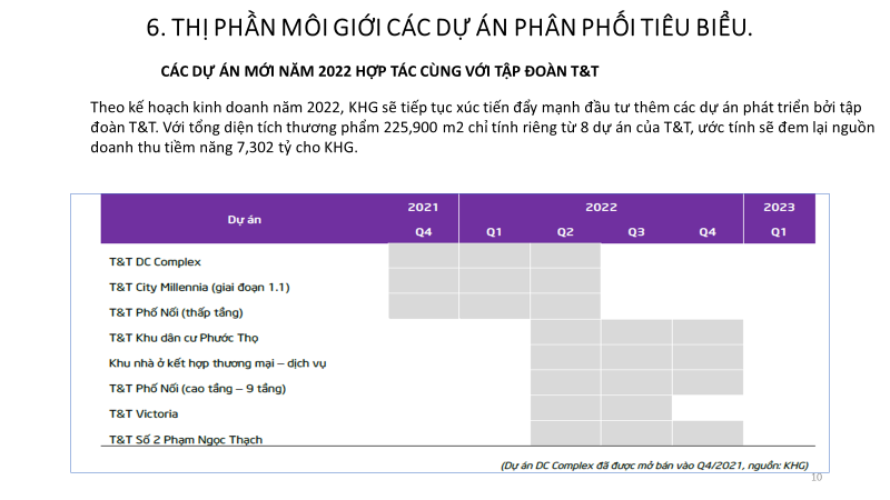 -Thị phần môi giới liên tục tăng trưởng, là đối tác chiến lược của nhiều tập đoàn Uy tín như T&T, Vinhomes, Sunshine, GS. Năm 2022 sẽ đầu mở bán 7 dự án BĐS hợp tác với T&T trong Q1 và Q2.
