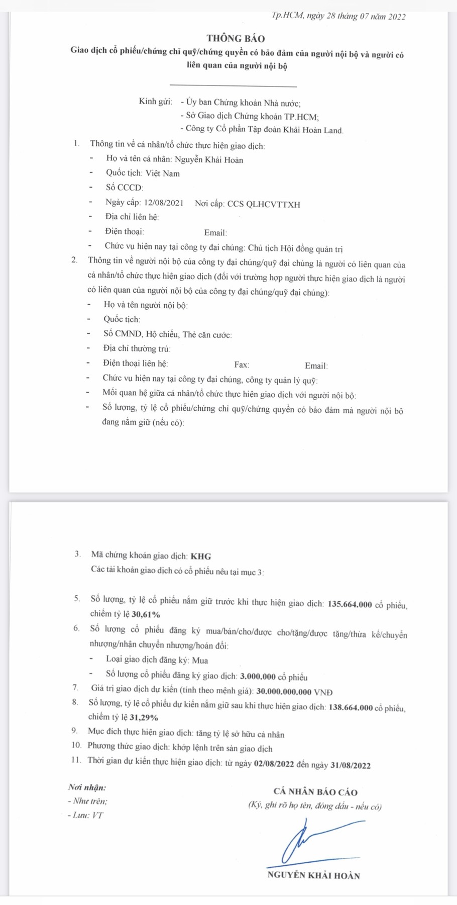 CTCP Tập đoàn Khải Hoàn Land (Mã: KHG): Ông Nguyễn Khải Hoàn, Chủ tịch HĐQT đăng ký mua 3 triệu cổ phiếu.