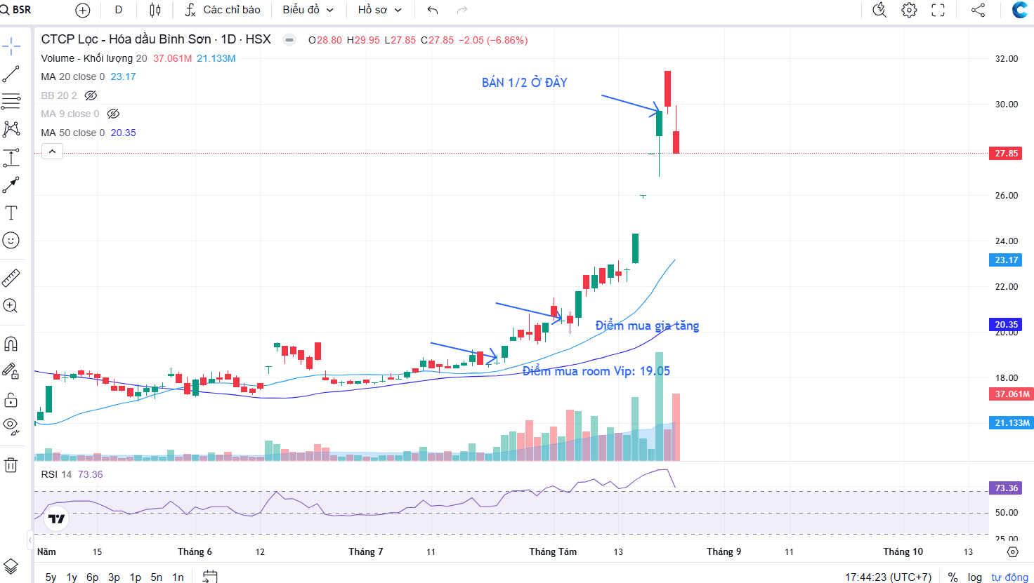 - Chốt 1/2 vị thế ở vùng 30 để khóa lợi nhuận ở mức + 55% ngày 29/7.