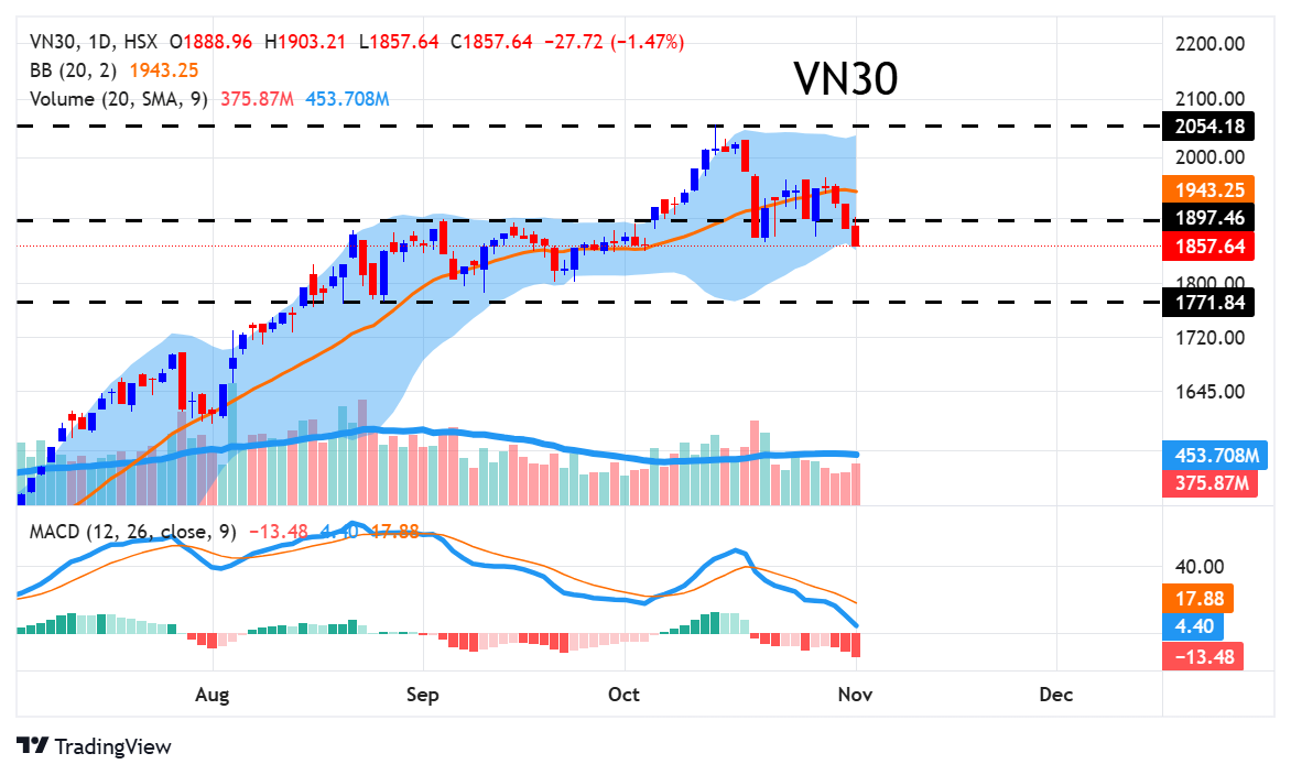 Nhìn vào VN30, hỗ trợ tiếp theo của VN30 là ở 1771. Hiện tại VN30 đang đóng cửa ở 1857, có nghĩa là VN30 vẫn còn khoảng 90 điểm dư địa để giảm tiếp khi lấy hỗ trợ gần nhất. Nhìn vào VN30, khá nhiều cổ phiếu đã lần lượt thủng hỗ trợ như nhóm ngân hàng (TCB, MBB, BID, VIB, VPB). Ngoài ra, SSI hay MSN cũng đã thủng nền giá và bắt đầu giảm trước. Hai nhóm trên đã thủng nền giá trước INDEX và VN30 nên khả năng sẽ quay đầu trước, đồng thời áp lực bán cũng sẽ giảm dần. Trong khi đó, nhóm VIN là nhóm chủ lực kéo VN30 và INDEX lên thì chưa giảm nhiều, hiện chỉ mới bắt đầu giảm, đặc biệt là VIC. Hôm nay, VIC còn kéo ngược lại, đóng góp khoảng 4 điểm giúp VN30 và INDEX giảm ít hơn. Khả năng cao VN30 sẽ còn giảm tiếp về vùng 1771, chủ yếu do nhóm VIN, trong khi các nhóm khác đã chiết khấu khá nhiều từ đỉnh, khoảng 20% trở lên.