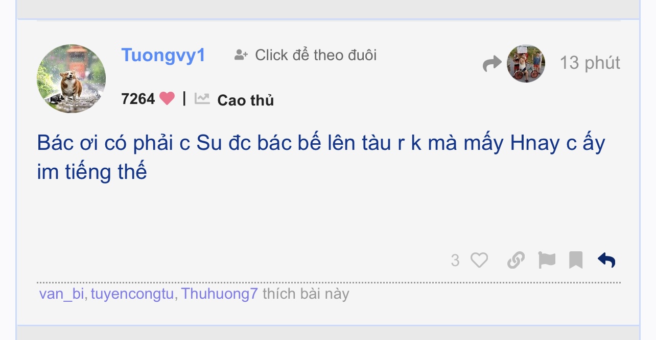 G9 @Mrkhoai … e vẫn sân ga… vẫn chờ bác… chưa lên tầu gì cả… hy vọng bác soi một tầu siêu CHUẨN… VIP… chở đầy bia 333 để đưa e và bà con bản Gà Bay về bờ an toàn ạ… mn bình tỉnh… an toàn vẫn là ưu tiên số 1 nhé… Pp cả nhà…