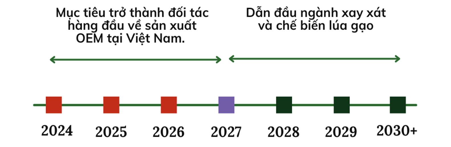 Tầm nhìn dài hạn của TCO không chỉ dừng lại ở lĩnh vực OEM, mà còn hướng đến mục tiêu dẫn đầu ngành xay xát và chế biến lúa gạo. Bắt đầu từ năm 2027, công ty sẽ thực hiện các chiến lược mở rộng chuỗi giá trị nông nghiệp thông qua các thương vụ M&A, bao phủ từ khâu giống, vật tư, phân bón đến trồng trọt, chế biến, kho vận và phân phối.