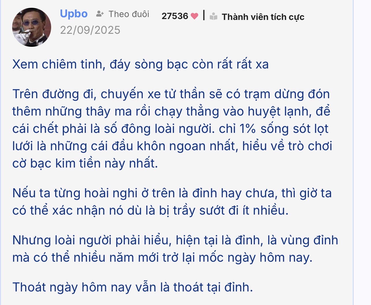 Không hiểu sao f247 cho tồn tại những thớt như thế này nhỉ, tư tưởng tiêu cực, ngôn từ lệch chuẩn xã hội. Cảm giác như trong thế giới thây ma, tởm
