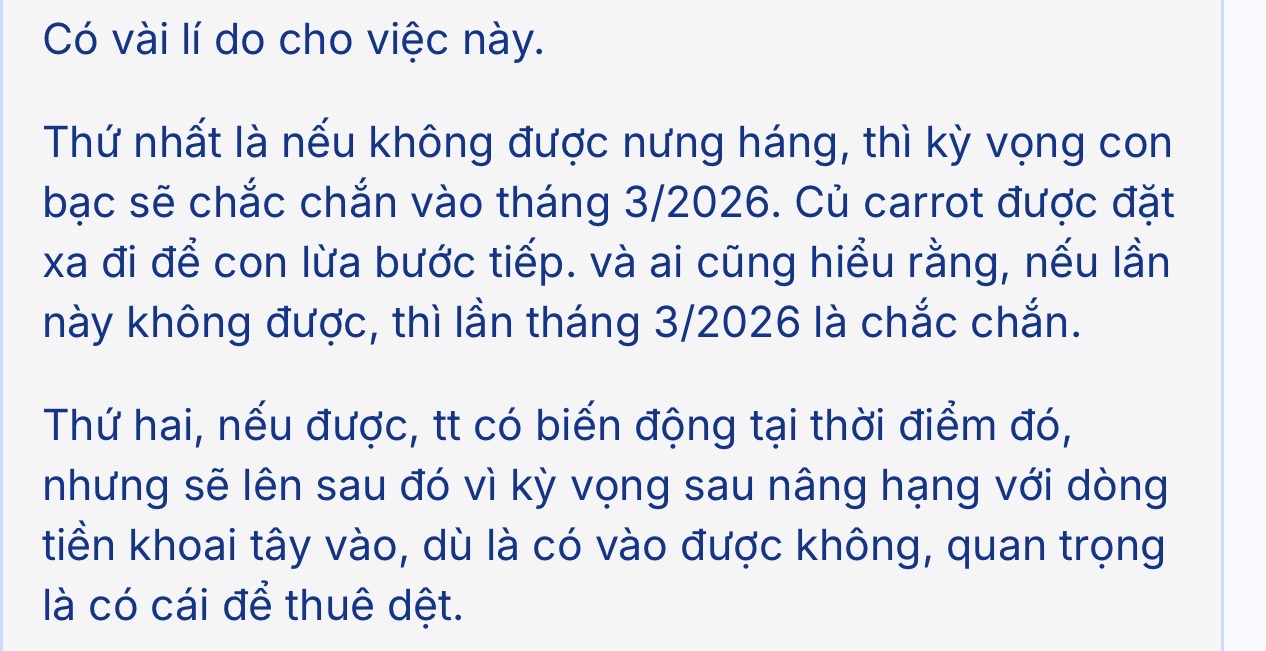 Thứ nhất là nếu không được nưng háng, thì kỳ vọng con bạc sẽ chắc chắn vào tháng 3/2026. Củ carrot được đặt xa đi để con lừa bước tiếp. và ai cũng hiểu rằng, nếu lần này không được, thì lần tháng 3/2026 là chắc chắn.