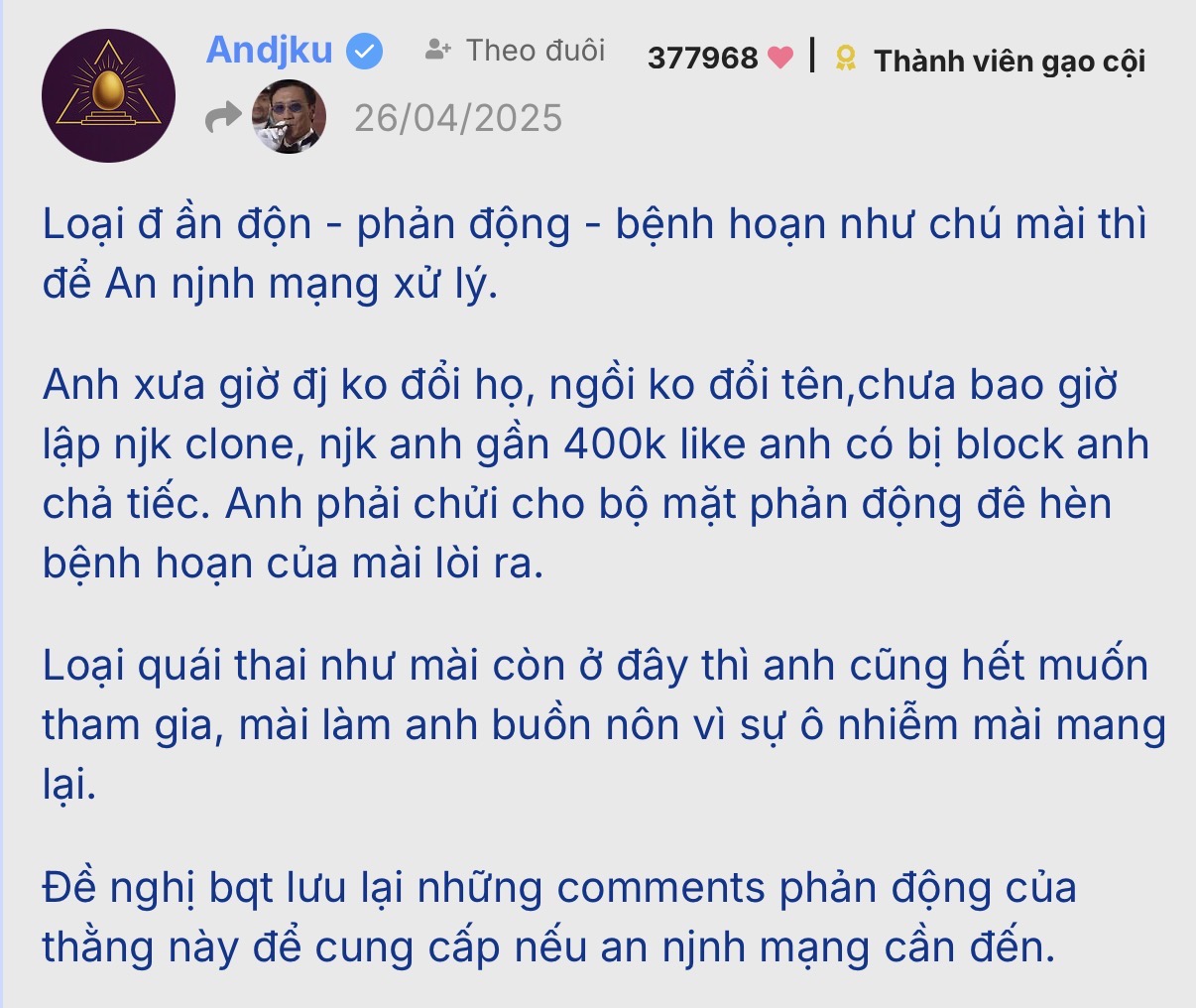 chửi càn hả.??da phả m.à.y thêm đ.ầ.n độn.nhá. ![]()
