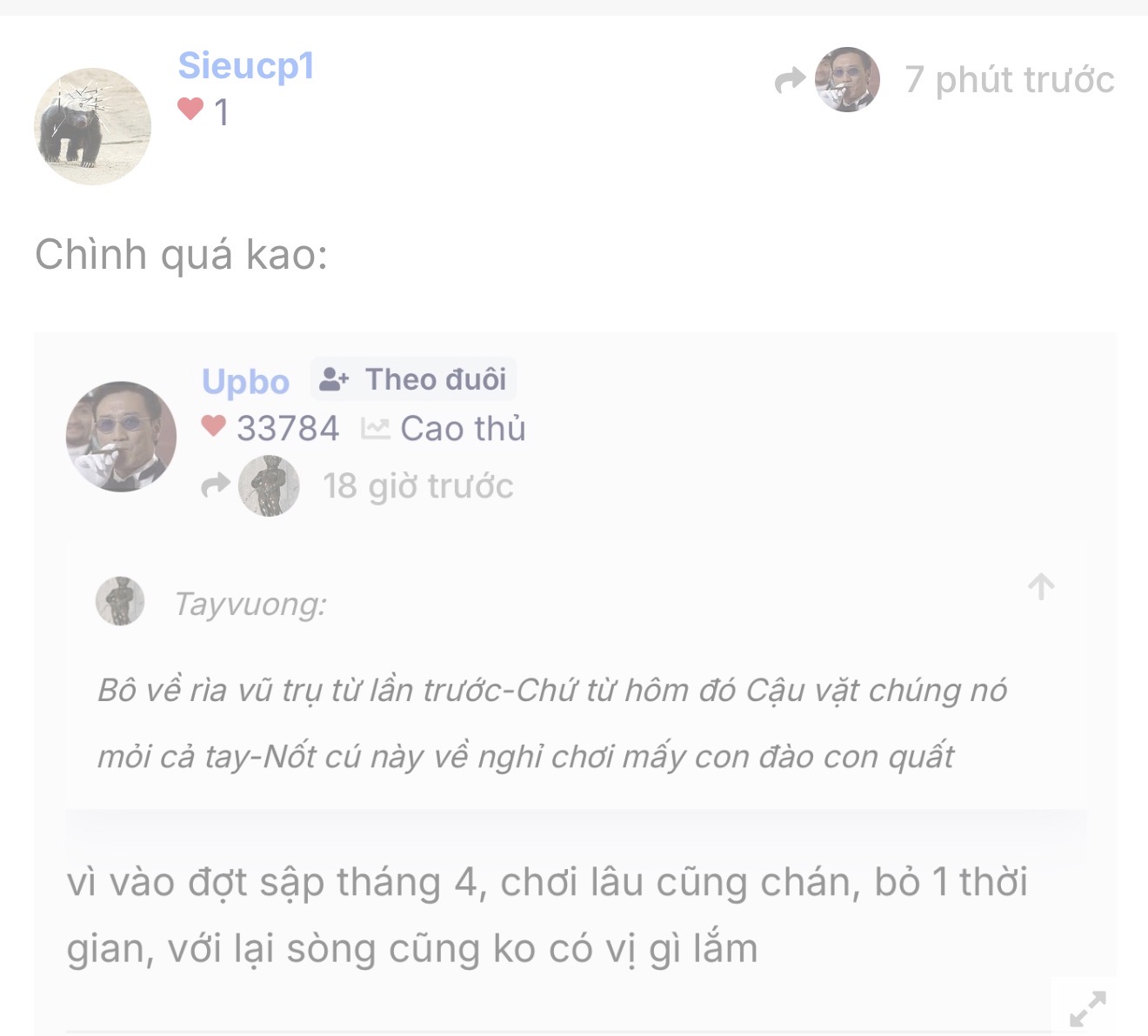 team Bô chờ team thôngass và jean cút loát, phe Khoái lạc giáo ngày nào đó sẽ múc đỡ cho có thanh khoản, dù nó lai lai người, nhưng cũng được xem là 30% là người, nên đối xử nhơn