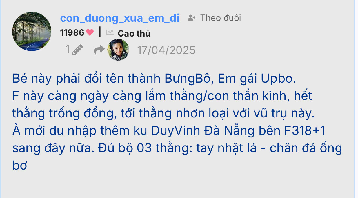 Ai cũng biết trên F này, các hạ chỉ sợ hãi ông Vuichogiaitri thôi, chỉ ông này làm chú cụp đuôi ướt bỉm thôi…