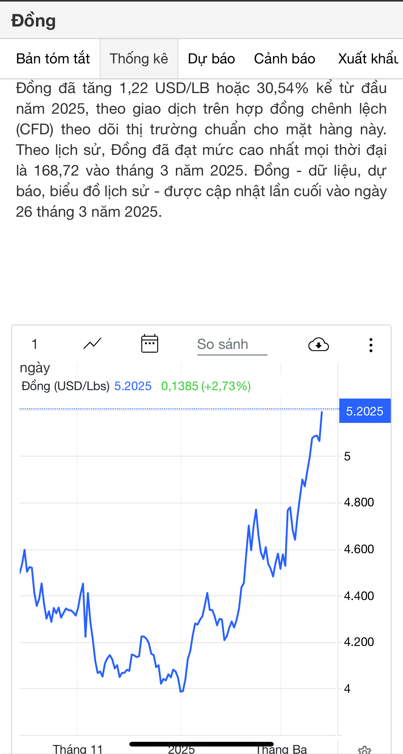 Các nhà phân tích tại Goldman Sachs và Citigroup dự đoán Mỹ sẽ áp thuế 25% đối với đồng trước cuối năm nay. Trong khi đó, Trafigura - công ty giao dịch đồng lớn nhất thế giới - dự báo giá đồng có thể đạt 12.000 USD/tấn, tăng mạnh từ mức khoảng 10.000 USD hiện tại.