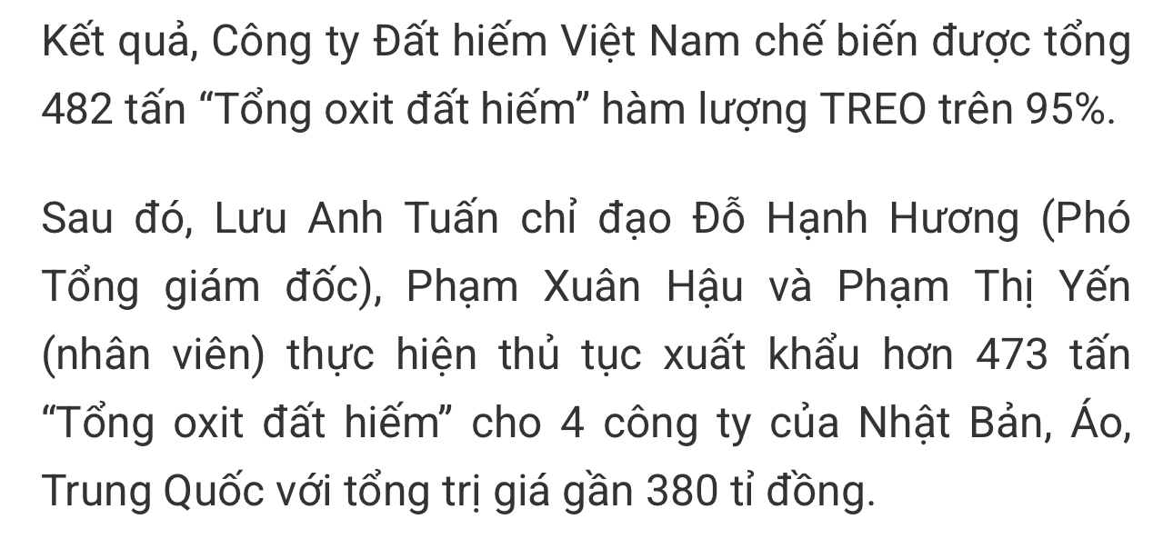 482 tấn ô xít đất hiếm có TREO > 95% bán lâu giá rẻ mà thu về 380 tỷ => 1k tấn bán đúng có thể thu về quanh 1000 tỷ