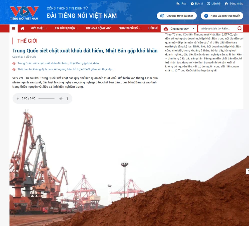 Trong bối cảnh đó, giới kinh tế Nhật Bản lên tiếng yêu cầu Chính phủ nước này đẩy mạnh đàm phán với phía Trung Quốc về việc nới lỏng các quy chế liên quan đến xuất nhập khẩu đất hiếm, song song với việc tìm kiếm các nguồn cung mới, nhằm giảm thiểu sự lệ thuộc vào một số ít nguồn cung chủ yếu như hiện nay.