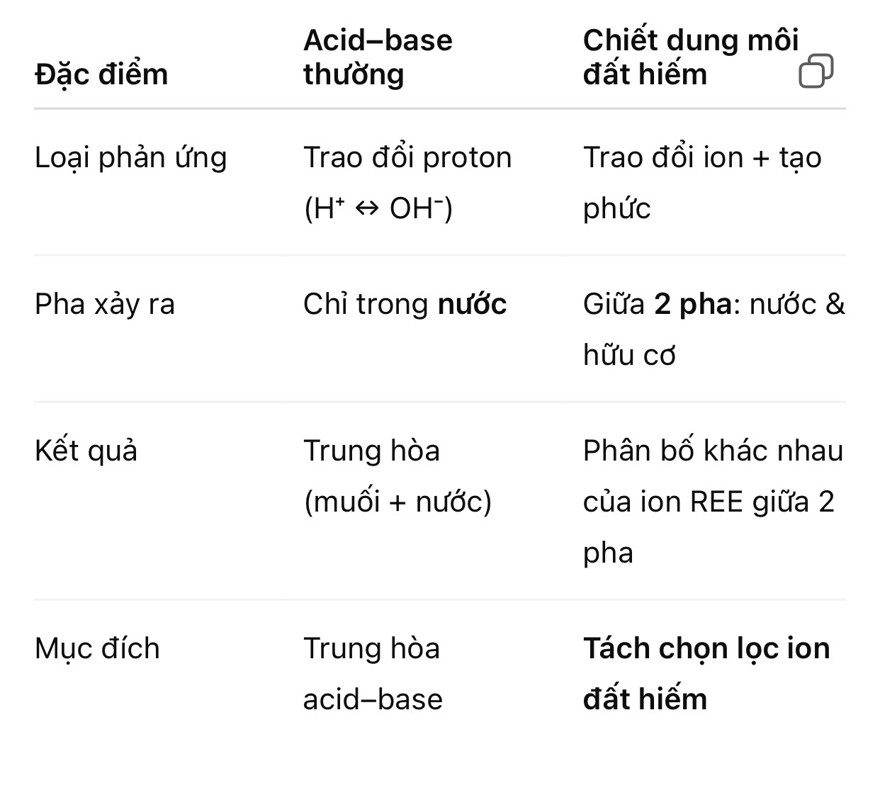 Kết quả: không phải 1 dung môi = 17 sản phẩm ngay, mà là dùng đúng một dung môi, nhưng kết hợp nghìn bậc và điều chỉnh pH → tách dần thành từng nguyên tố.