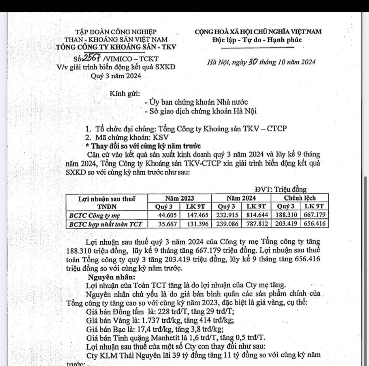 KSV Về kết quả kinh doanh 9 tháng đầu năm, Vimico ghi nhận 9.615 tỷ đồng doanh thu thuần, tăng 8% so với cùng kỳ năm ngoái. Lợi nhuận sau thuế đạt 788 tỷ đồng, gấp 6 lần cùng kỳ 2023. Theo giải trình, lợi nhuận toàn tổng công ty tăng mạnh là do lợi nhuận của công ty mẹ tăng, đến từ việc giá bán bình quân các sản phẩm chính tăng cao so với cùng kỳ năm 2023, đặc biệt là giá vàn