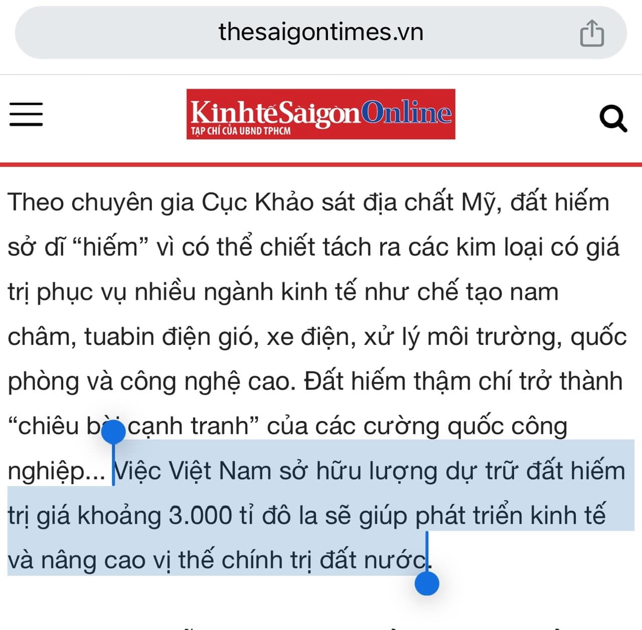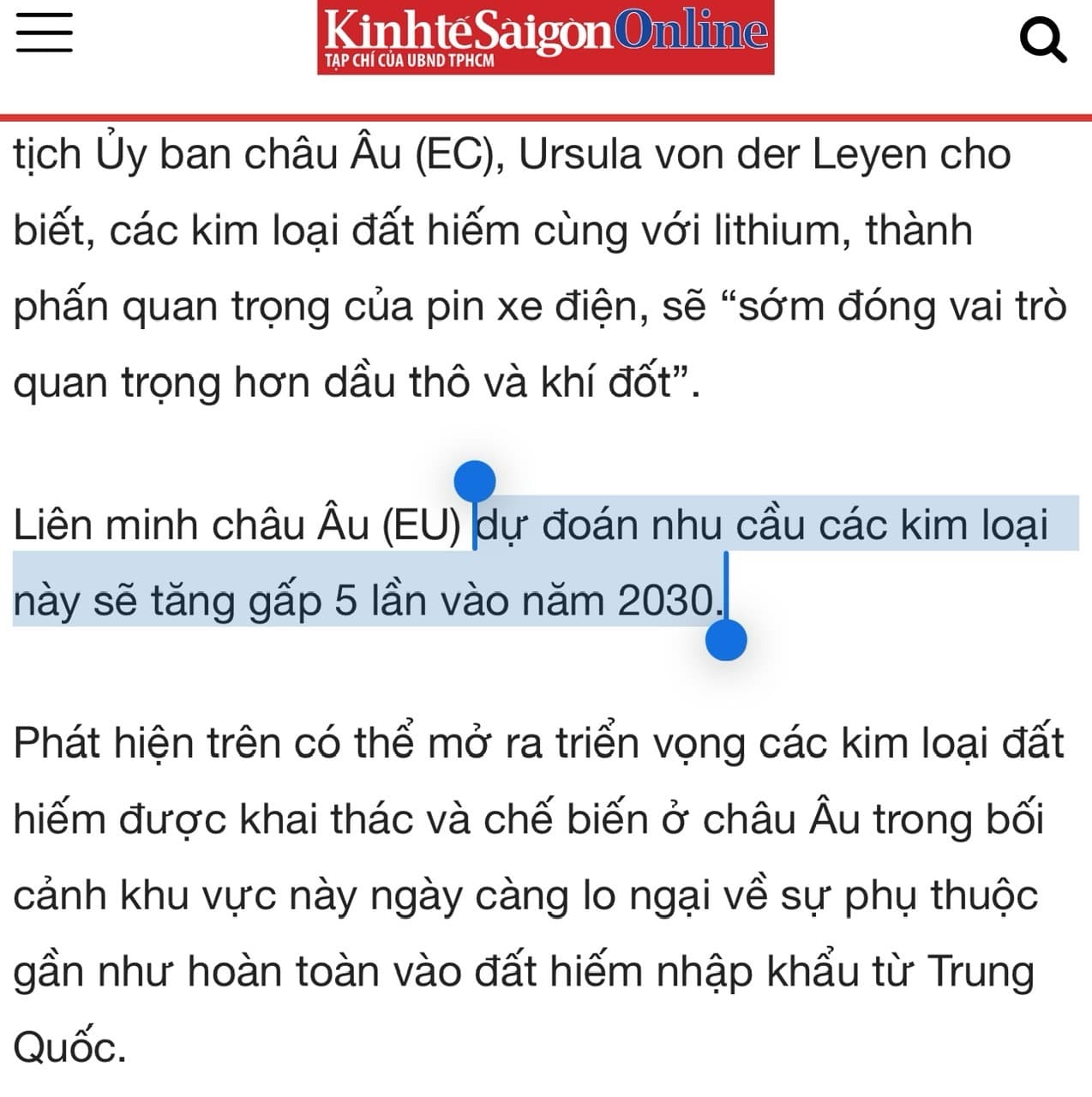 Giá trị hiện tại 3000 tỷ usd ? , năm 2030 như cầu đất hiếm toàn cầu tăng gấp 5 lần => giá tiếp thục leo thang