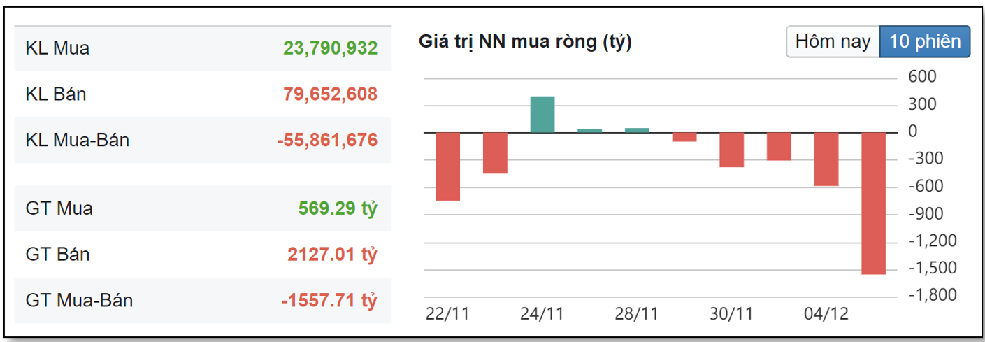- Khối ngoại đã liên tục bán ròng 5 phiên, giá trị bán ròng tăng rất cao trong 10 phiên qua. Tổng giá trị bán ròng lên tới 1,557 tỷ đồng => Điều này chắc hẳn sẽ làm xuất hiện một lực cung lớn trên thị trường, và cũng sẽ tác động đến tâm lý nhà đầu tư trong nước
