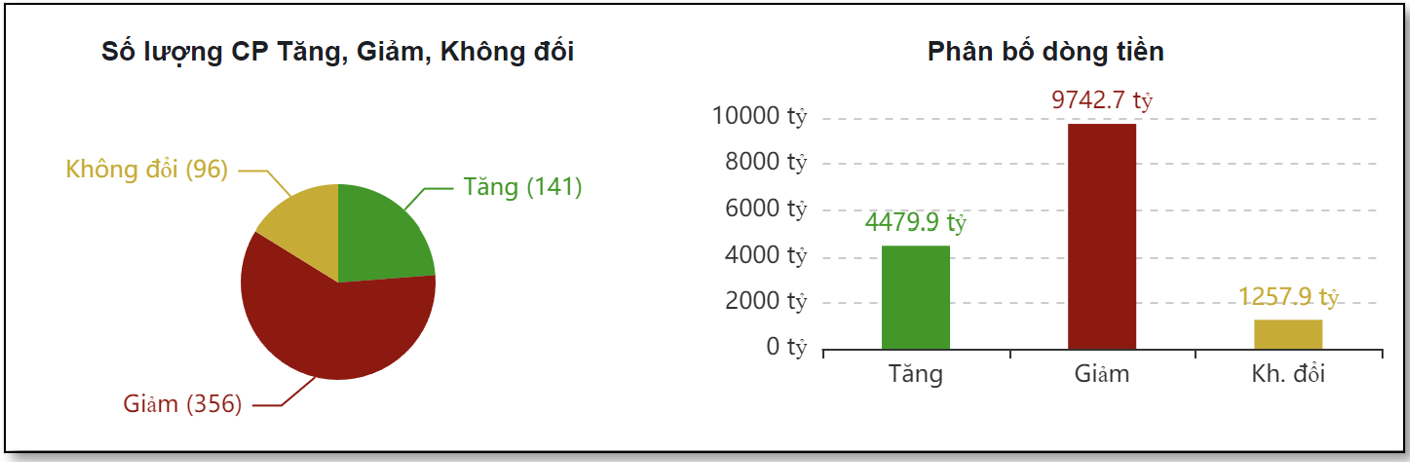 - Kết phiên, Vnindex giảm 4.5 điểm, đóng cửa tại mốc 1115 với 141 mã tăng, 356 mã giảm => Như vậy, nếu xét về số lượng thì số mã giảm chiếm ưu thế so với mã tăng. Tuy nhiên, không có tình trạng giảm mạnh hay bán tháo nên không có gì đặc biệt lo lắng.