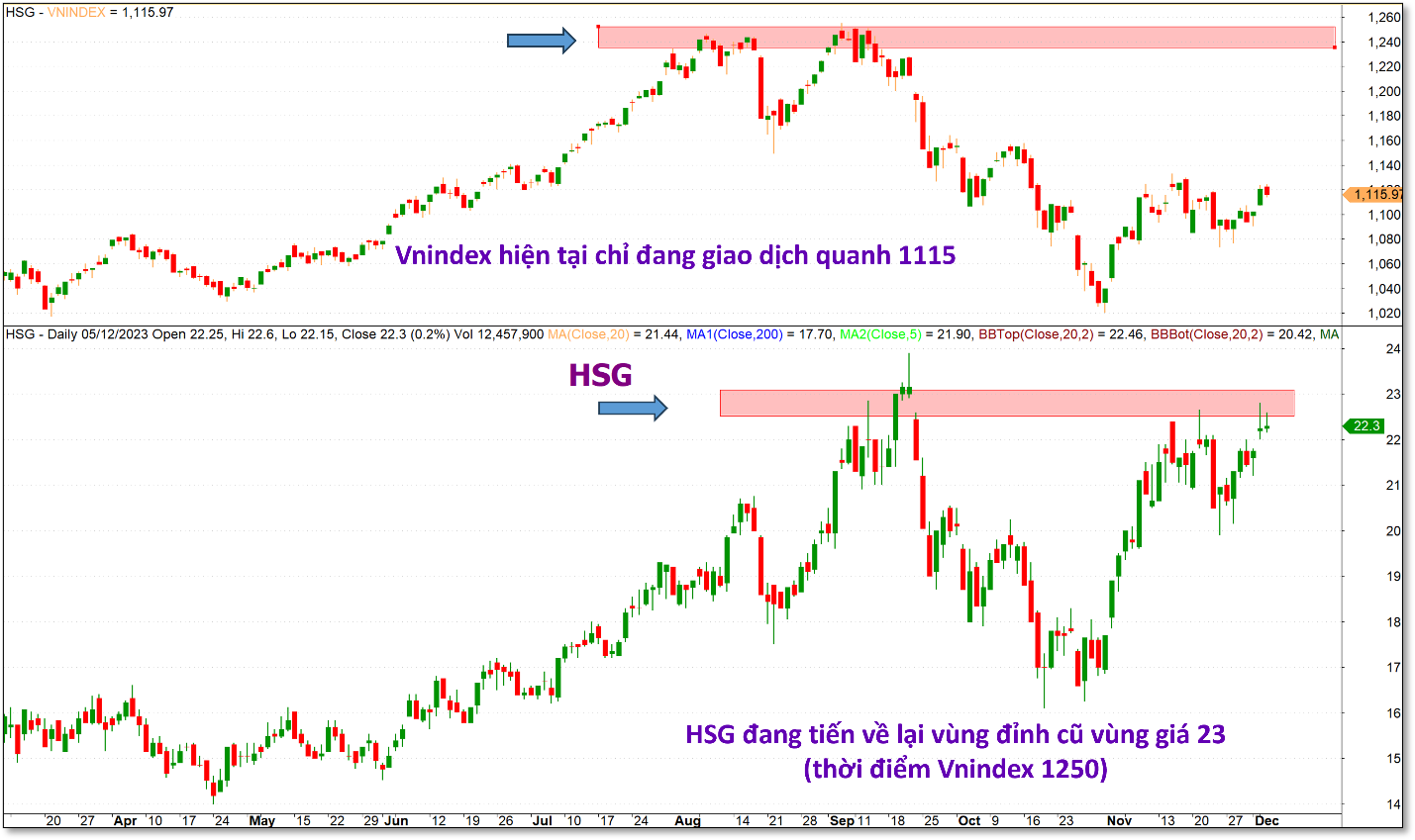 Tại thời điểm Vnindex 1250 điểm, HSG đang giao dịch tại vùng giá 23. Tuy nhiên hiện tại, Vnindex chỉ quanh 1115, nhưng SHS đã bật tăng tốt, đang tiến gần về lại đỉnh cũ.