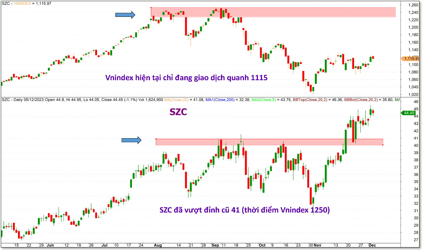 - Tại thời điểm Vnindex 1250 điểm, SZC đang giao dịch tại vùng giá 40.5. Tuy nhiên hiện tại Vnindex chỉ quanh 1115, nhưng SZC đã bật tăng tốt, vượt đỉnh cũ giá 40.5 và đang giao dịch quanh 44.5