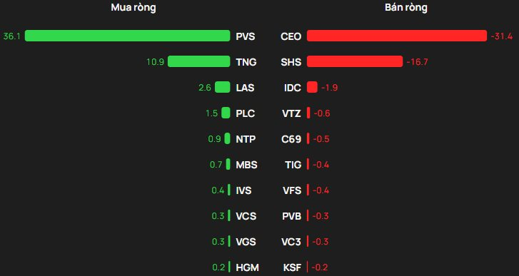 Ở chiều bán ròng, CEO dẫn đầu với giá trị khoảng 31 tỷ đồng, tiếp đến là SHS (xấp xỉ 17 tỷ), trong khi các mã còn lại chỉ ghi nhận mức bán ròng dưới 2 tỷ đồng.