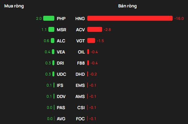Ngược chiều, HNG bị khối ngoại bán ròng 16 tỷ đồng. Ngoài ra khối ngoại cũng bán ròng tại ACV, VGT,…